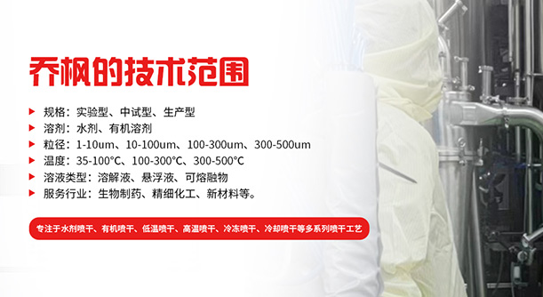 上海喬楓實業有限公司,成立于2012年,是從事噴霧干燥設備的研發設計、生產、銷售(小型噴霧干燥機,實驗型噴霧干燥機,35℃低溫噴霧干燥機,有機溶劑噴霧干燥機,低溫閉式循環噴霧干燥機、超細粉末噴霧干燥機、噴霧冷凍干燥機、真空噴霧干燥機、氣流噴霧干燥機,噴霧造粒干燥機,離心噴霧干燥機沸騰制粒機等)和售后于一體的綜合性公司,本公司現成為一家致力于為生物制藥、精細化工、新能源、陶瓷造粒及食品工程等領域提供全套解決方案的整線交鑰匙工程企業。